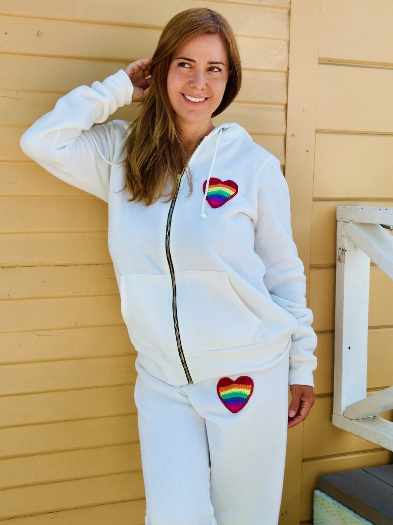 White Off-the-Shoulder Sweatshirt with Neon Orange “STOKED” Crochet