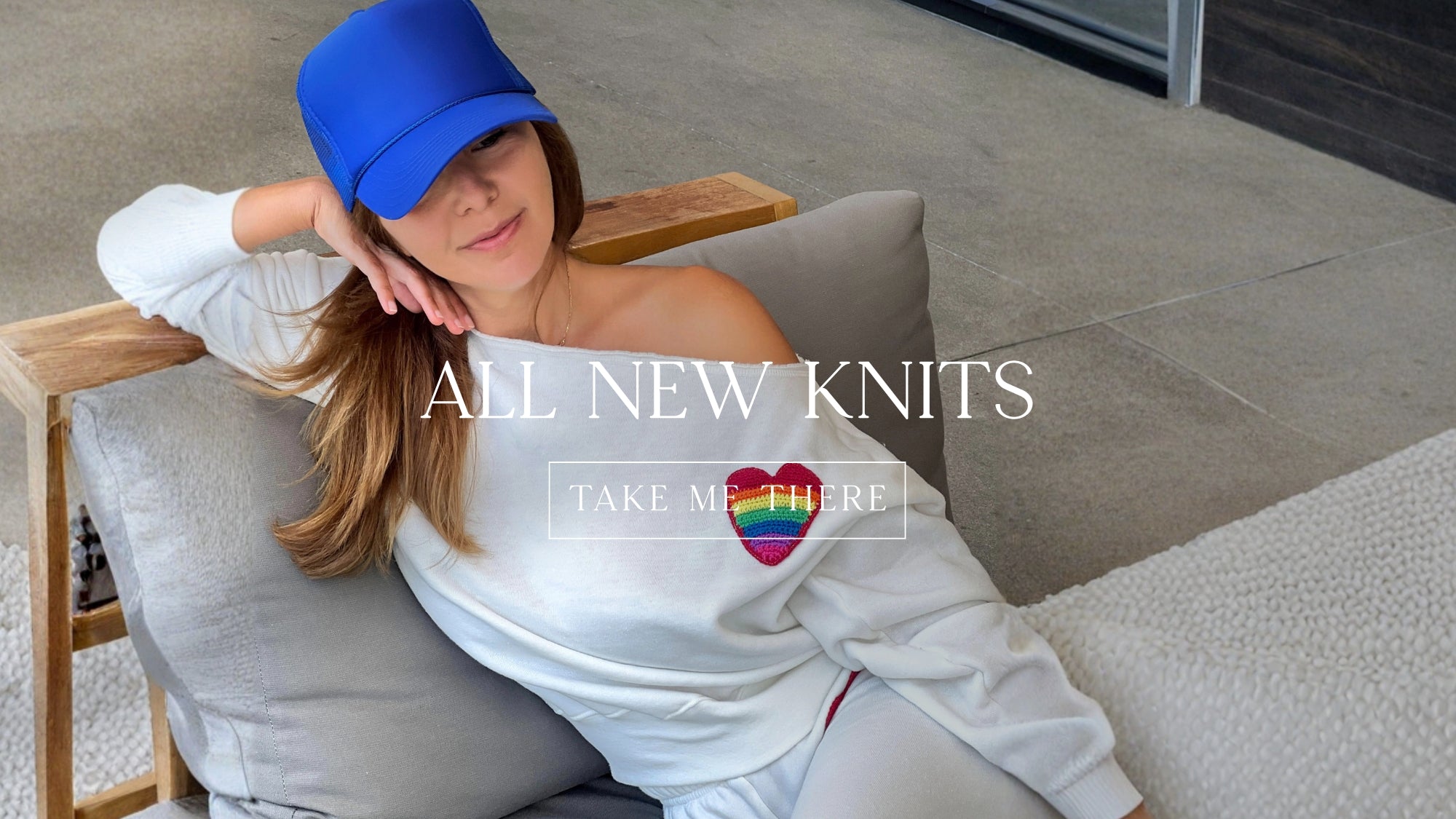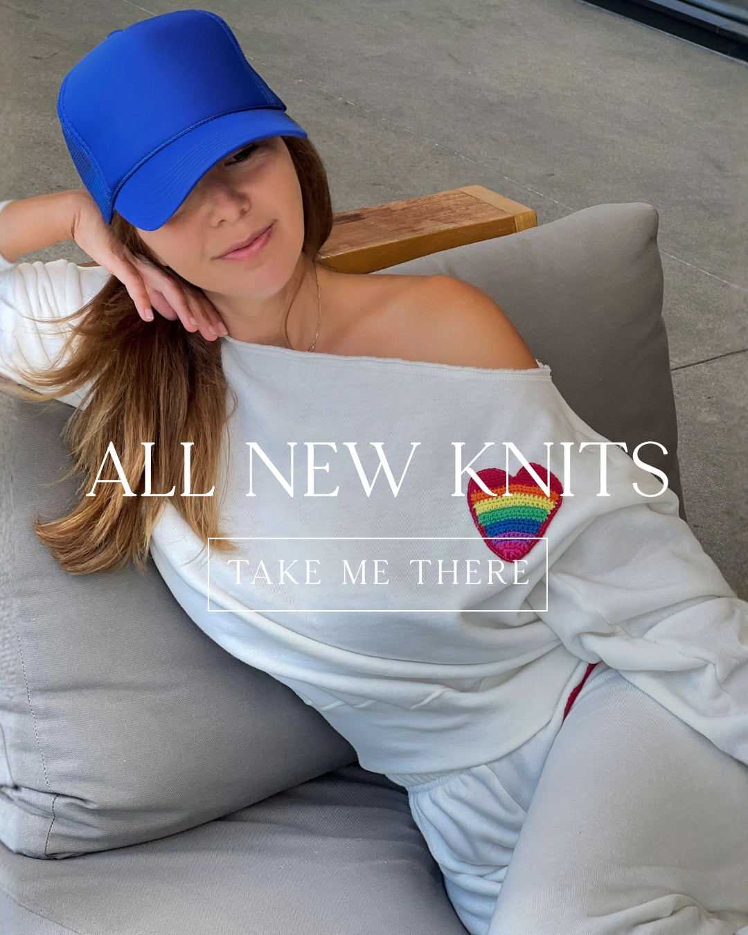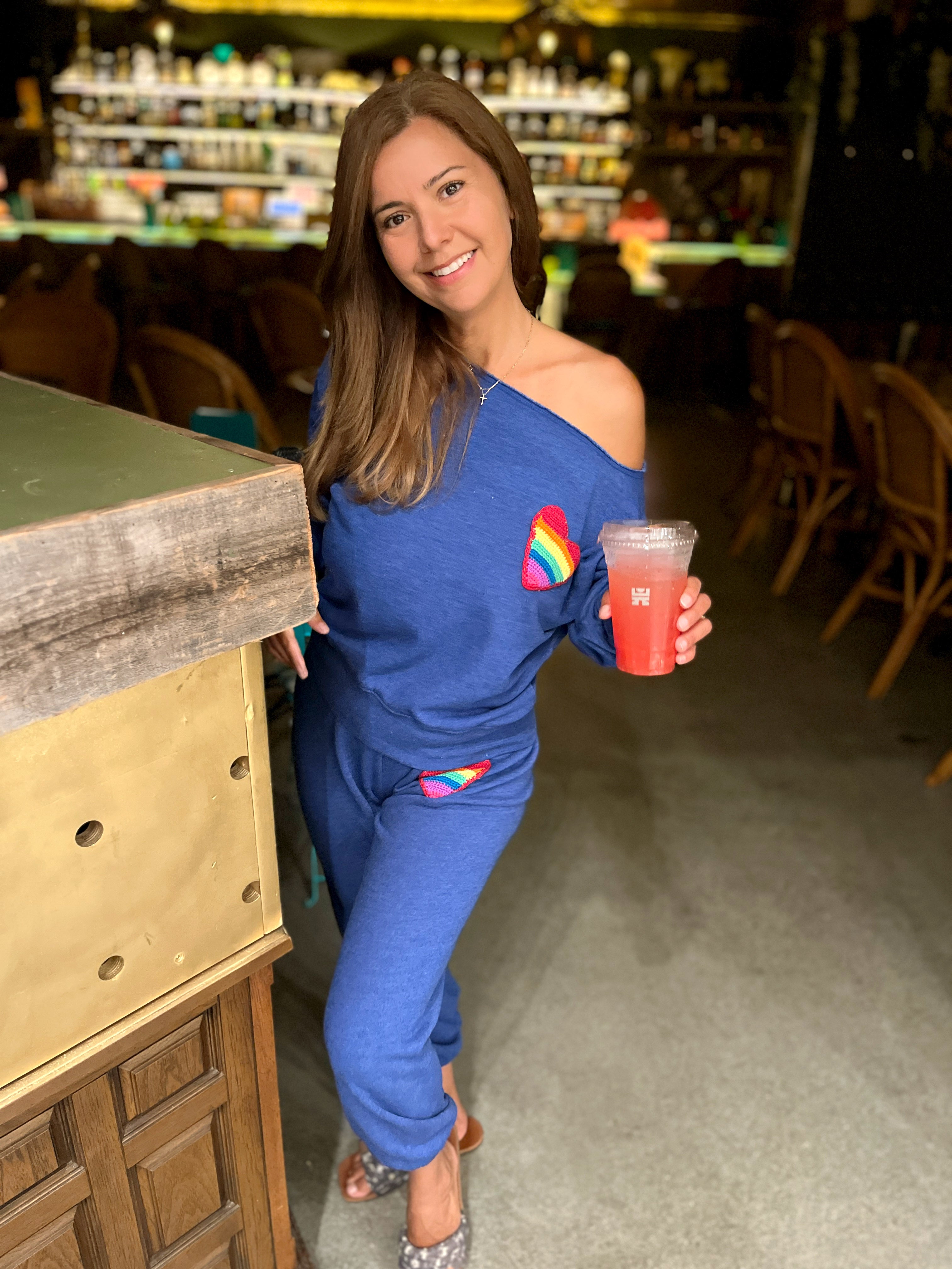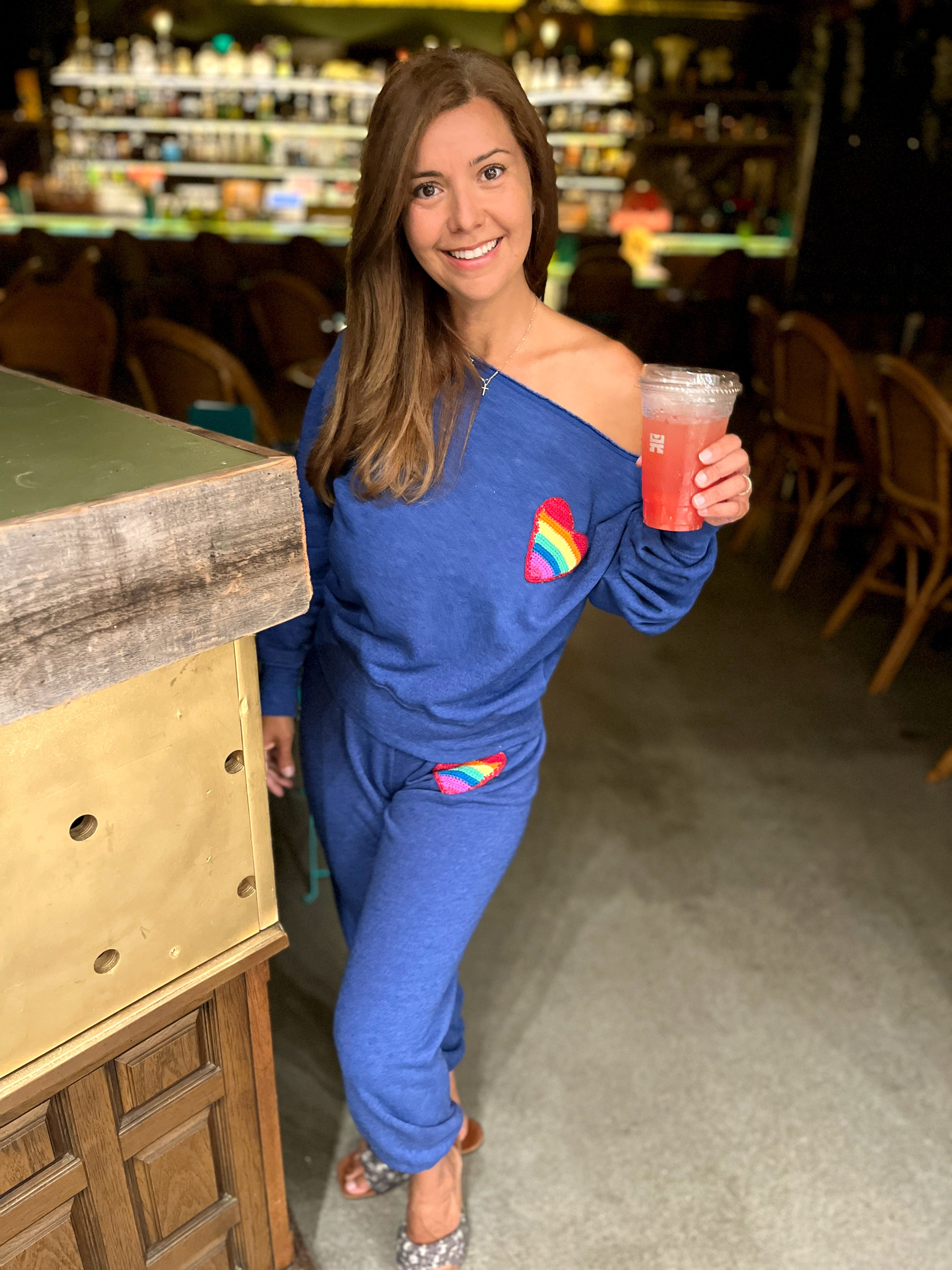 Blue Off-the-Shoulder Sweatshirt with Neon Pink “STOKED” Crochet